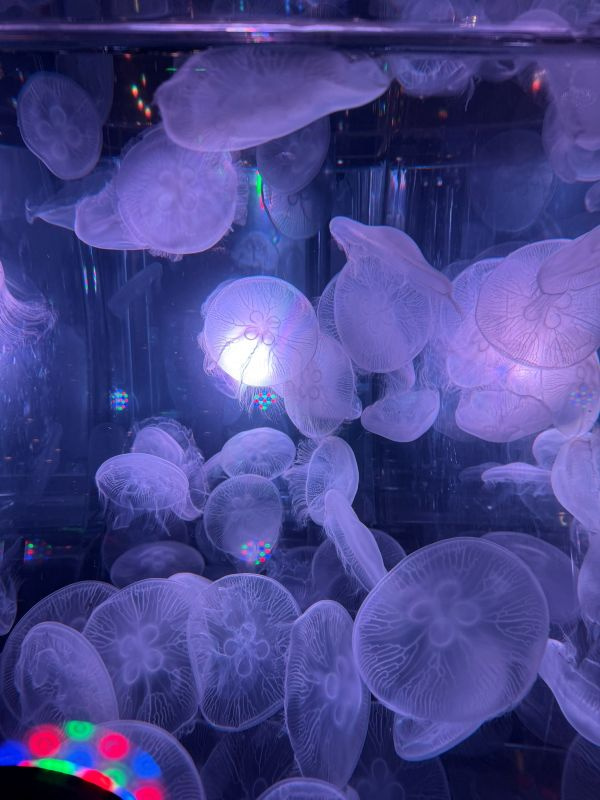 展示エリアでは、クラゲが幻想的にライトアップされていて、