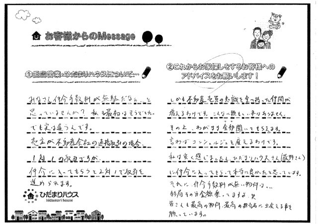 私は安く感じましたし、ひだまりハウスさん(荻野さん)に仲介に入ってもらって本当に良かったと思っています。