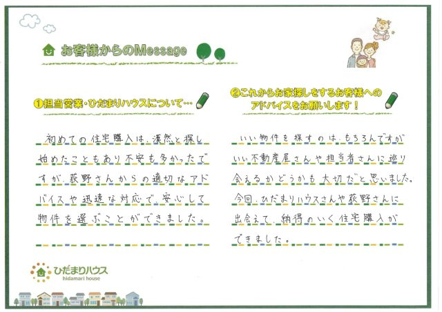 - いい物件を探すのはもちろんですが、いい不動産屋さんや担当者さんに巡り会えるかどうかも大切だと思いました。今回、ひだまりハウスさんや荻野さんに出会えて、納得のいく住宅購入ができました。