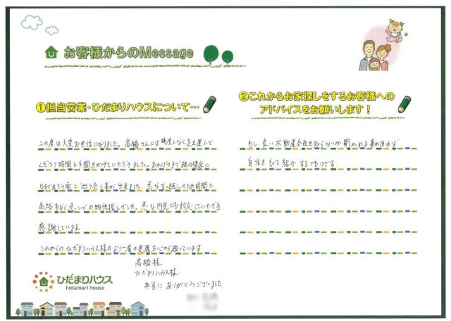 お住まい探しには時に思うように進まないこともございますが、最後には素晴らしいご縁に恵まれ、無事ご成約に至ったこと、私自身も大変嬉しく感じております。