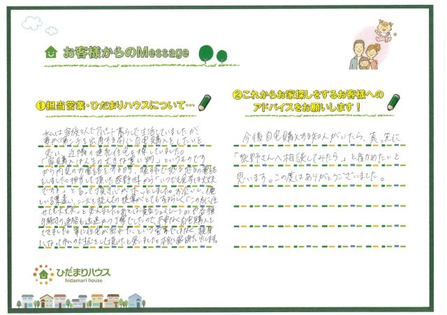 - 私は家族3人でアパート暮らしで生活していましたが、妻が第二子を出産する前に自宅購入したいと思い、近隣の建売住宅を探していました。「家購入は人生の大きな買い物」というものですから内見のお電話する時、緊張で恐る恐るの電話をしました。担当して頂いた荻野様から「いつでも見学は大丈夫ですよ」と言って頂き心がホッとしました。お会いし、優しい言葉遣い、ニーズを捉えての提案がとてもすばらしく「この方に任せても大丈夫」と思えました。あとは資金シミュレーションや各種手続きの連絡も迅速かつ丁寧でしたので、不安なく自宅購入をできました。単に住宅が売れた、という営業ではなく、親身になって私の対応をして頂いたと思いました。本当に感謝いたします。