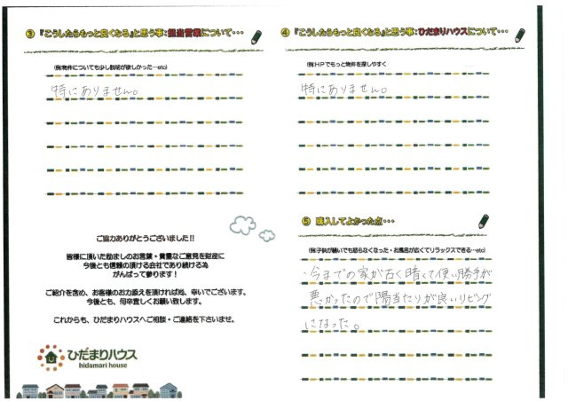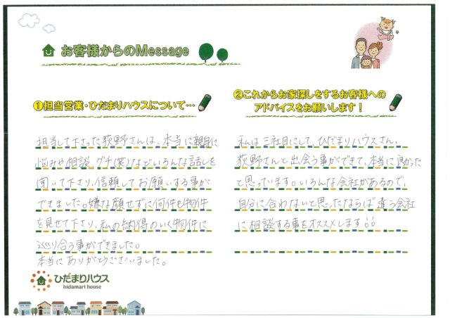 - 私は三社目にして、ひだまりハウスさん、荻野さんと出会う事ができて、本当に良かったと思っています。いろんな会社があるので、自分に合わないと思ったならば違う会社に相談する事をオススメします!!
