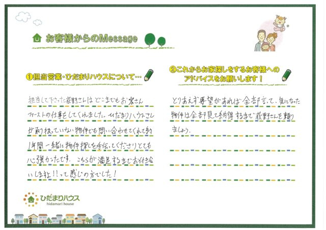 最終的にご納得いただける物件に巡り会うことができ、私も本当に安心いたしました。